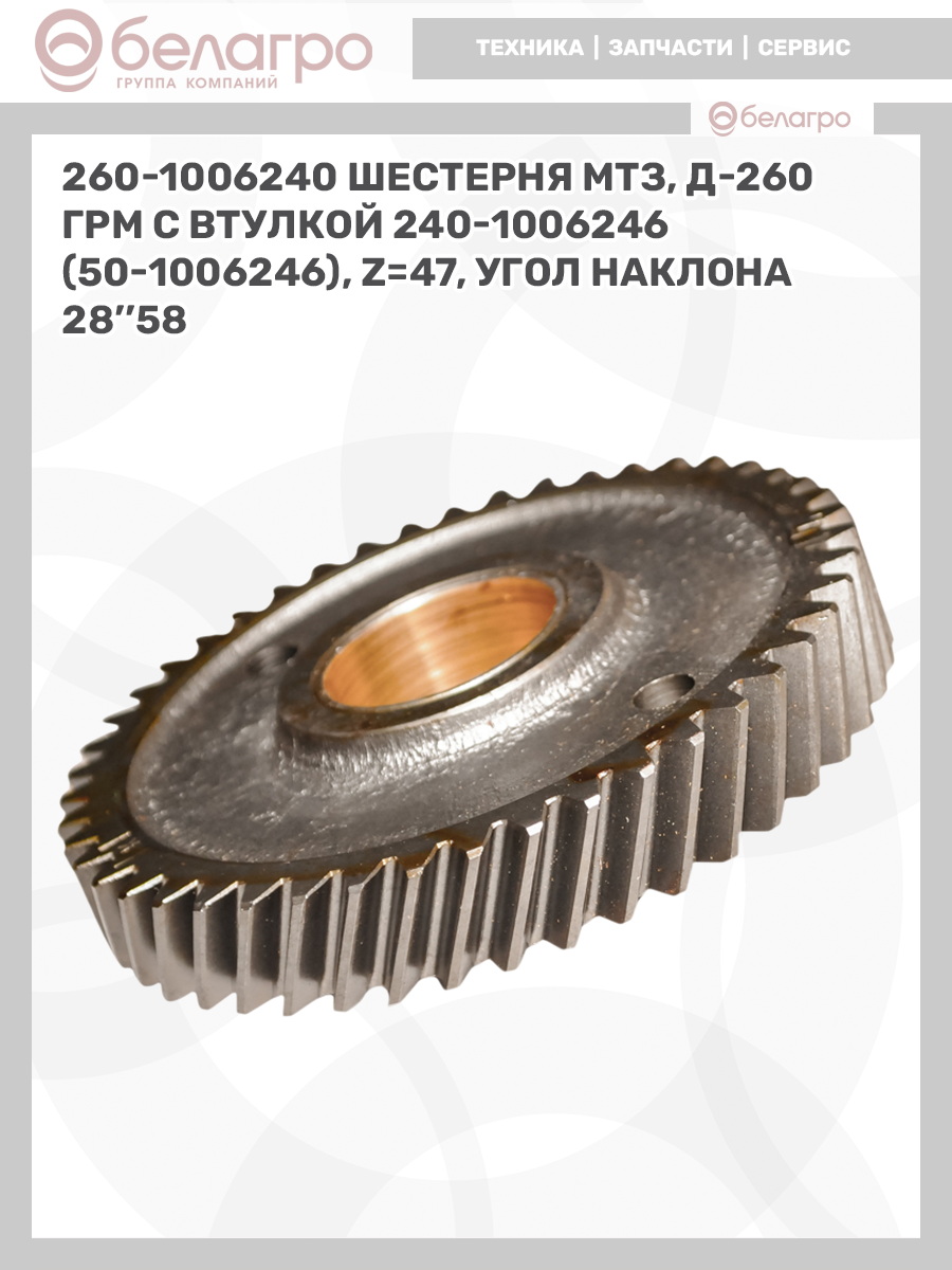 260-1006240 Шестерня МТЗ, Д-260 ГРМ с втулкой 240-1006246 (50-1006246), z=47, угол наклона 28''58, (А)