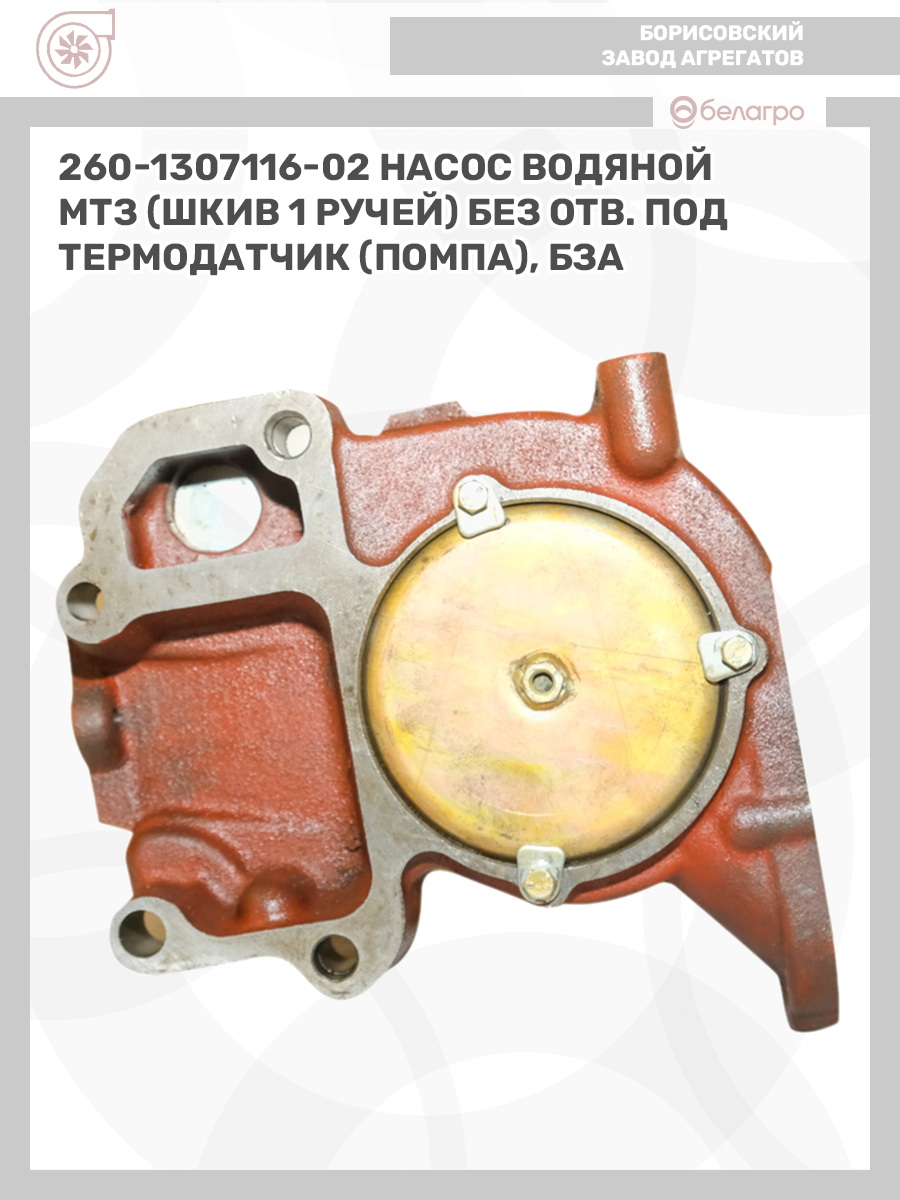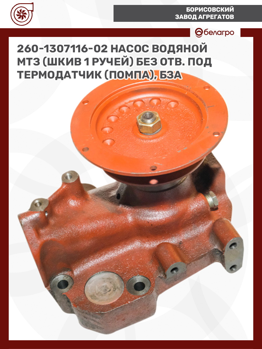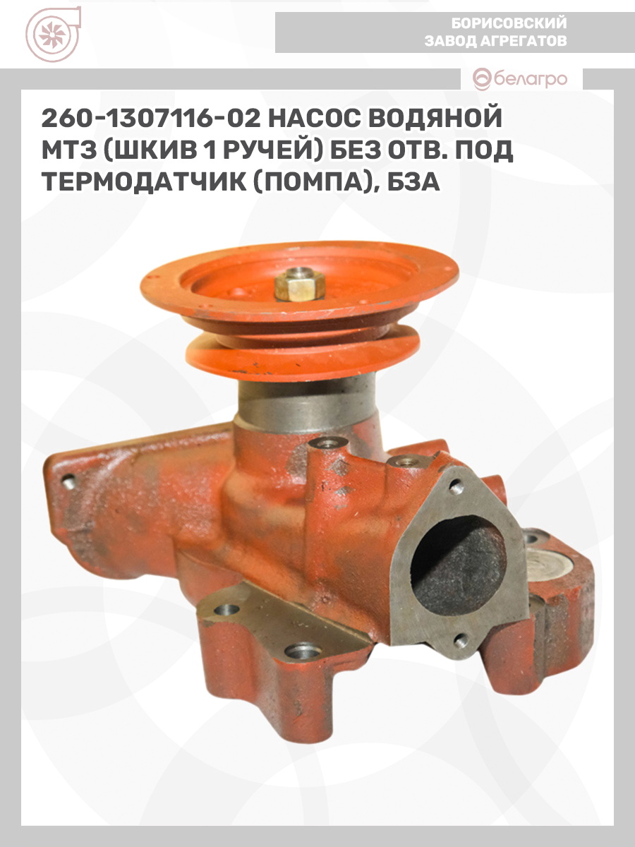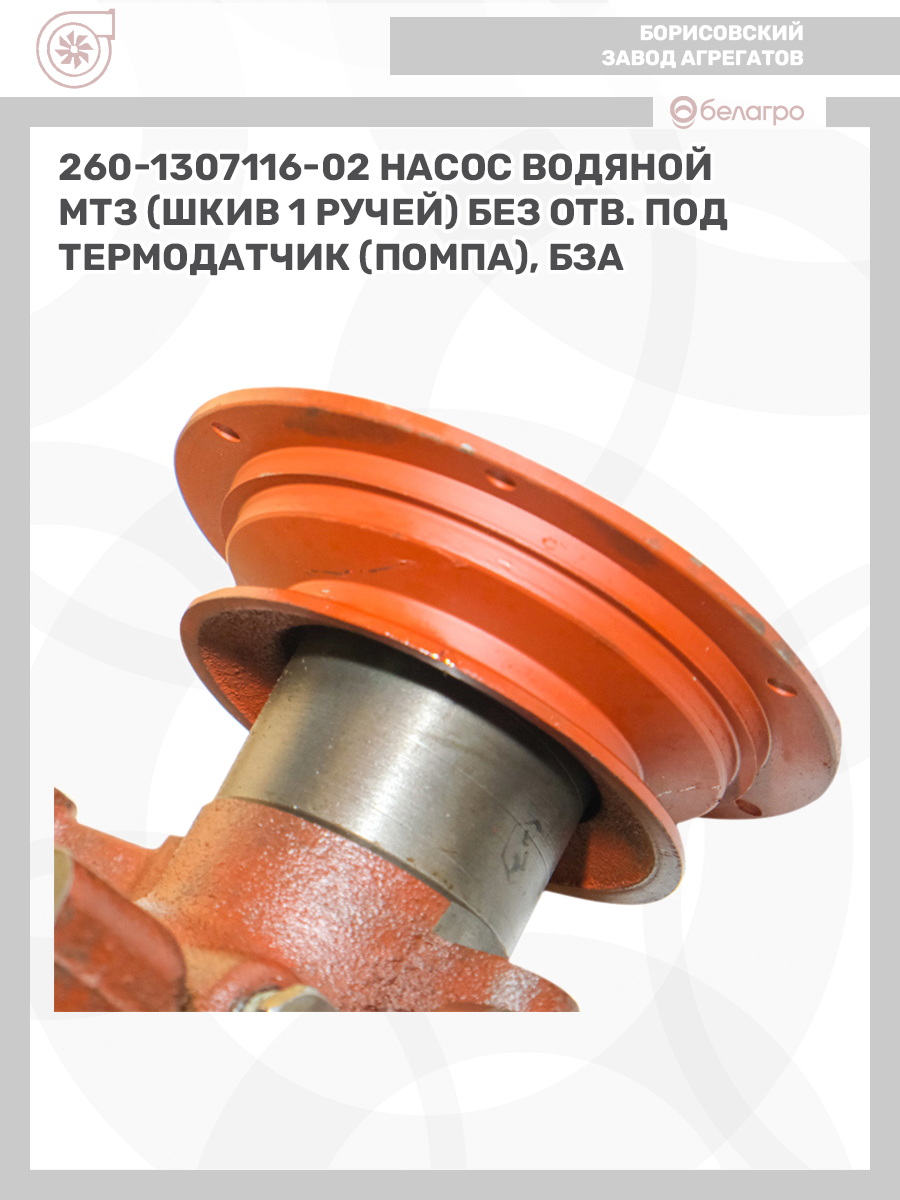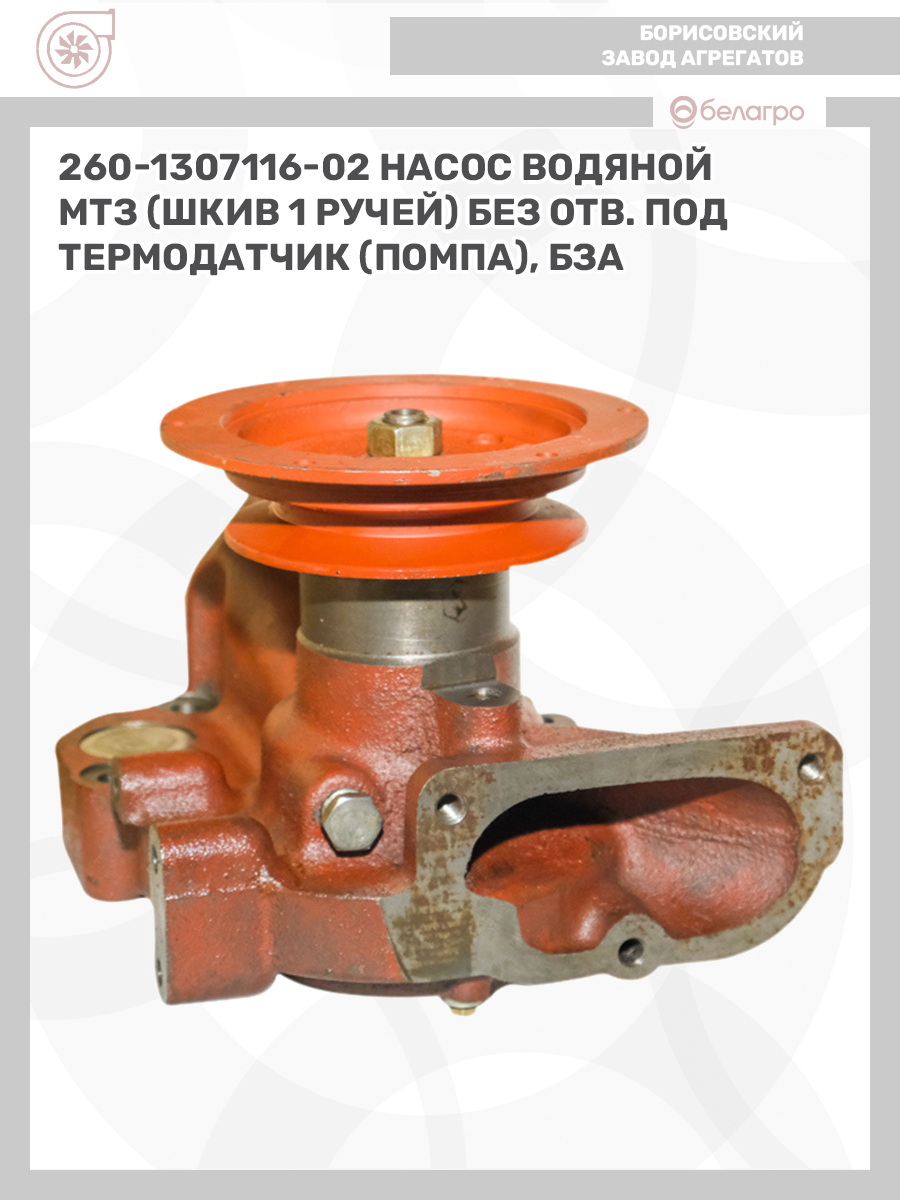 260-1307116-02 Насос водяной МТЗ (шкив 1 ручей) без отв. под термодатчик (помпа), БЗА