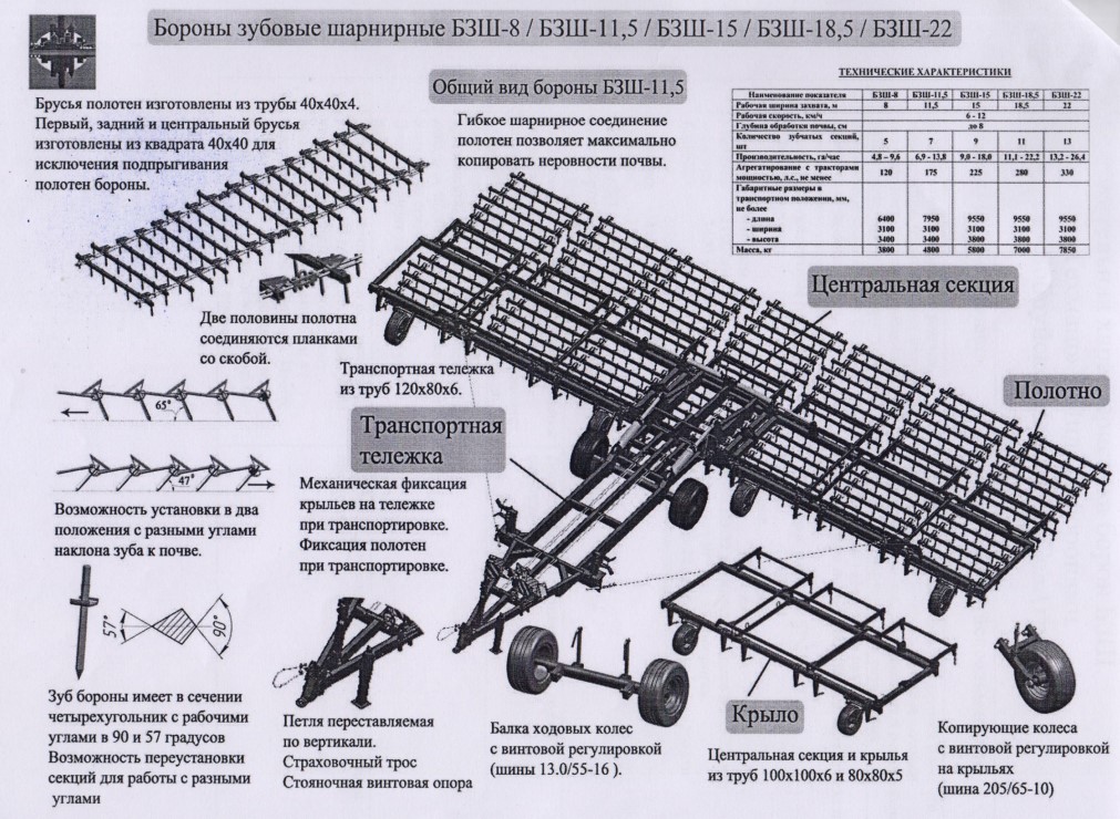 Борона зубовая шарнирная БЗШ предназначена для выравнивания и рыхления верхнего слоя почвы, уничтожения сорняков в начальной фазе развития, предпосевной обработки, заделки минеральных удобрений, высеянных разбросанным способом.
