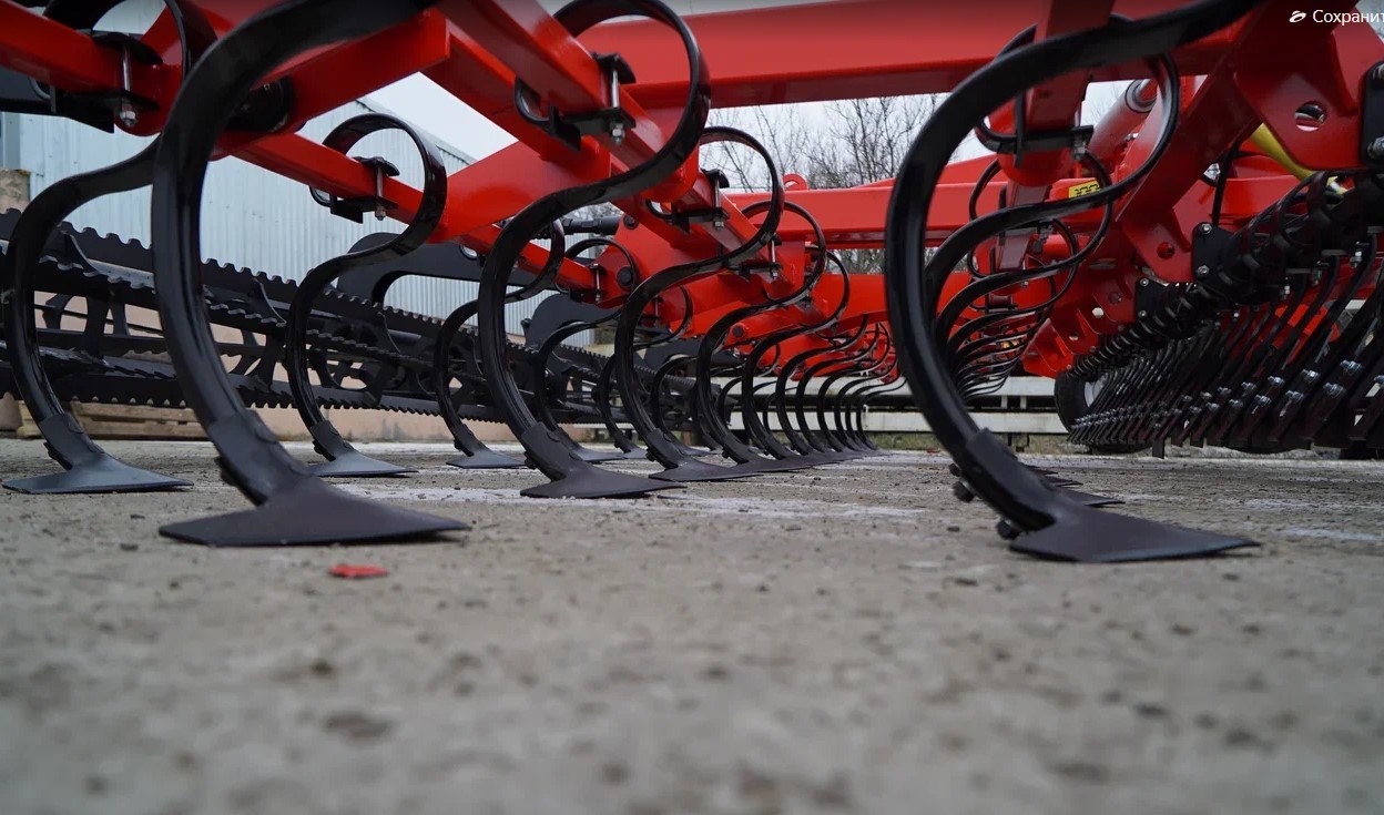 11. Пружинные боронки вычесывают подрезанную растительность и выравнивают микрорельеф поля. При обработке засоренных почв, с целью исключения забивания, глубина обработки и угол наклона (0, 15, 30 градусов) пружинных боронок настраивается механически. Зуб пружинной боронки изготовлен из специально закаленной стали с диаметром 12 мм, что позволяет вести работу в самых тяжелых условиях и на максимальных глубинах.